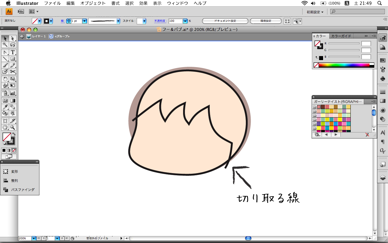 最終的に茶色にして切り取る線より下の部分は削除します。