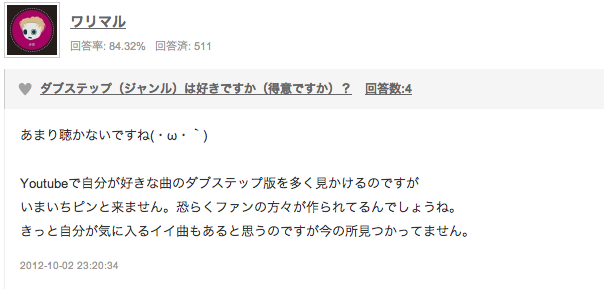 日常生活 2012/10/07 おへんじ メラ汰様、メッセージありがとうございます! お返事を書かせて頂きました。 よければ左下の「つづきはこちら」でご覧下さいな(´ω`人) 不眠症に関してですが、おかげ様で現在は学校に復帰出来るレベルに回復しました! 卒作のゲーム制作も再会して今はプレゼン用の資料を作ってたりしますだ。 どもご心配ありがとうございます。 ブロステップ全然知らなかったですね。ニコニコ大百科を見た感じでも かなり新しいジャンルなんですね。 拝聴したのですがダブステップより個人的に好きですね(´ω`*人) スピードコアみたいに攻撃的だったり挑発的なジャンルが好きになり易いせいでしょうか。 My Name is Skrillexのキーボドクラッシャーのサンプリングの使い方にビックラしました。 そういや最初、私がどこでダブステップについて書いたのか失念してたのですが インタビューズでダブステップの質問に答えてましたねΣ(・д・`) ↓ひょっとしてコレでしょうか。 インタビューズではややこしい回答になっちゃいましたが テクノ系とは無関係の自分が好きなアーティスト(HollywoodundeadやSlipknot) のリミックス曲について書いてます。 ↓の2つの曲がまさに聴いてみた曲だったのですが…。 HollywoodUndead(Resolve remixed) - Young Dubstep Remix Slipknot(Filth remixed) - Psychosocial Dubstep Remix もちろん『嫌い』とまでは言いませんが、少しピンと来ない感じがします(・д・`;) テンポやリズムの速さ、音の激しさにこだわる癖があるからでしょうか。 こういった二時創作的なダブステップはよく見かけるのですが オリジナルの曲はあまり見かけなかったり…。