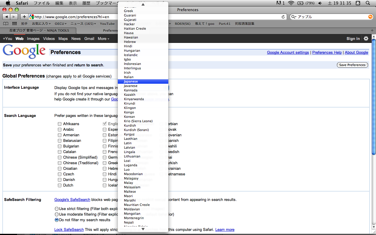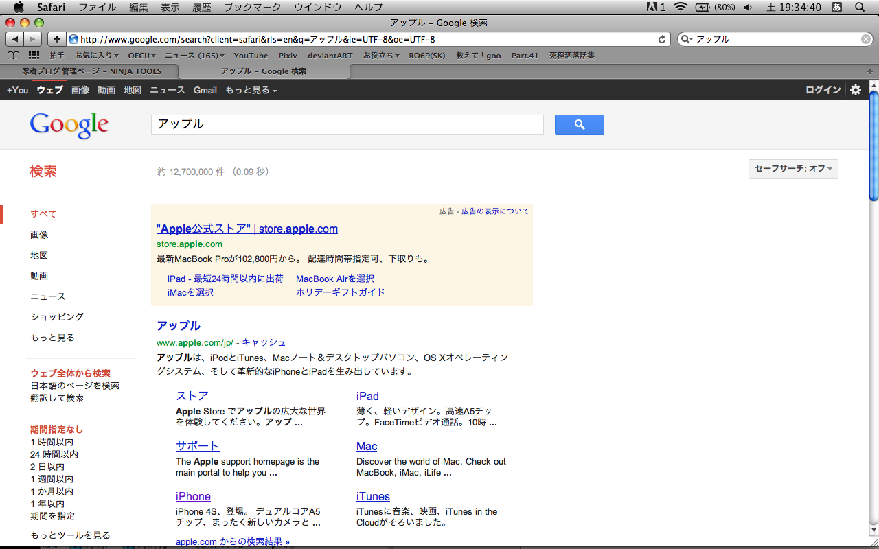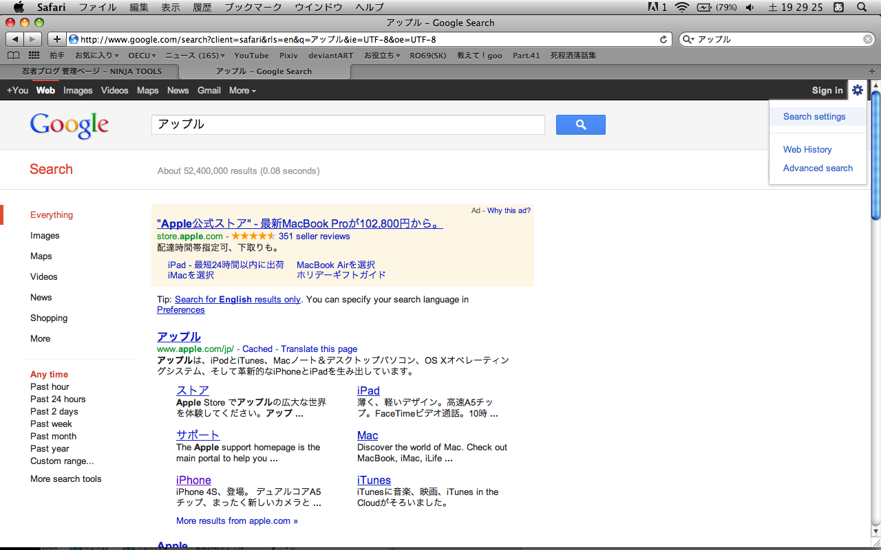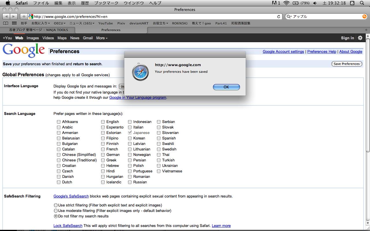 お役立ち情報 2011/11/12 ブラウザの右上で検索すると英語版Googleに。日本語版Googleへ戻す方法 自分のパソコンはOSがMacでブラウザはSafariなのですが、 ブラウザの右上で検索した結果が全て英語版Googleで表示されてしまって凄く不便でした。 (全く設定をいじっていないので、バグか不具合っぽい) 最近deviantARTばっかり見てたのが原因かもしれません。 しかも、元に戻す方法がネット(主に「教えて!goo」や「Yahoo知恵袋」)で探しても 古い情報しか載ってなくて更に困りました。 なので現在(2011年)の正しい対処方法を記載しておきます。 ①何でもいいので検索して、右上の歯車をクリック、「Search setting」をクリックする。 ②「Interface Language」が「English」に選択されているので「Japanese」を選択 ③最後に「Save Setting」のボタンをクリック。表示されたウィンドウはOKを押します ④これでブラウザの右上で検索しても日本版Googleで検索が出来ます。 検索キーワード用: 右上 Google ブラウザ 英語 日本語 Safari