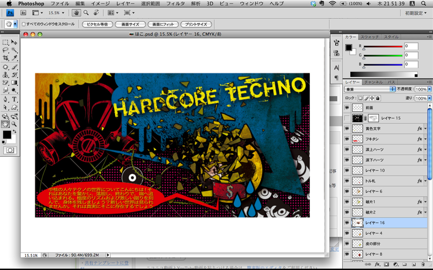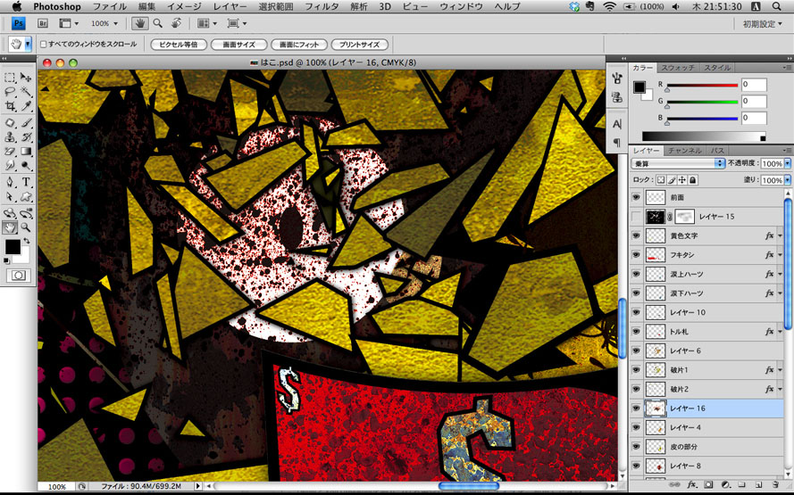 イラスト 2011/11/24 はこ 学校の課題で描いているイラストです。 個人的にまだまだ物足りない感じだけど、明日提出なので これ以上進める事は出来なさそう。背景にもっとオブジェクトいっぱい増やしたかった。 あと赤いフキダシの形もイマイチ。もっとモコモコした感じにしたかった感じ。 ちょっと見えにくいと思うんだども 実は左上のガスマスク、素材を使わず自分で頑張って描いてみました。 普段なら面倒なので素材を使うんだけどね。一度まじめに描きたかった。 (もしかしたらコレで時間が無くなった…?) 印刷するので解像度は350ppi。ここまで拡大できます。おっきい。