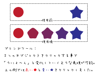 イラスト 2011/08/21 PPG Key Rings Illustratorのブレンドツールの機能を多用した絵。 Pixivに載せてから失敗したなぁ、と思った点を加筆してます。 ロゴとチェーンの部分だけですが。 今回は練習作品ということであまりガールズの可愛さは強調していません。 ほっぺたも赤く塗ってなかったり。 「ブレンドツールとはなんやぞ!?」と言う人向けに。 よくIllustratorの参考書を読んでいると↑こんな感じの図が載ってますよね。 これがブレンドツール。 二つの絵を描いたらその二つの絵の間を補完してくれます。 補完するコマの数を「ステップ」と呼んでいて 何ステップ描画するのか設定できます。 今回の絵ではこういう風にブレンドツールを使っています。