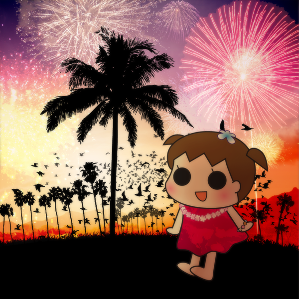 イラスト 2011/06/24 フーちゃんinハワイ 「うちの3姉妹」より長女のフーちゃん描きました。 ぷりっつ先生の最新作「ぷりっつ家は今日ものほほん」でも 一家でハワイに行かれたときの話が出てましたよね。 あれを読んでて特別編でムームーを着て踊ってるフーちゃんを 思い出したのでハワイのフーちゃんをアレンジしつつ描いてみました。 アレンジだけど実際に漫画でも花火あがってましたよね。時間は違うけどね。 あとパスとブラシを利用して地面に草を生やしました。 んでこちらがIllustratorのみの未加工状態 モチロンですが背景の9割はフリー&有料素材。手描きではありません。 (それでも意外と配置に苦労した) なんだか殺風景で怖い(つω・)