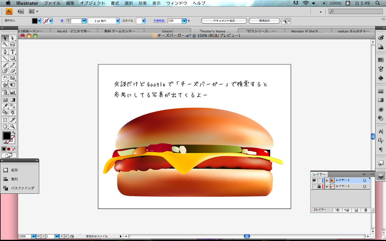 日常生活 2011/05/08 イラレバーガー ↓最近ハマってる曲 この曲ってピアノなんかで弾いたらすごく綺麗な曲になりそう。 Youtubeで探してもピアノカバーしてる人が少ないのが残念。 楽譜があれば弾いてみたい。 イラレのメッシュツールを利用してハンバーガーを製作中。 あんまりにもお腹がすいてるときにハンバーガーが食べたくて描き始めたのですが メッシュツールは普段使わないので難しい(つω・)