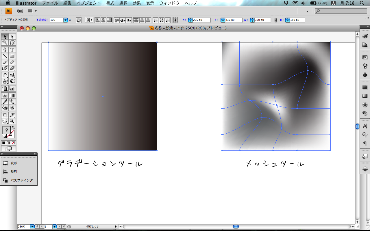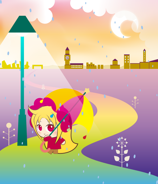 イラスト 2011/05/16 かえりみち 本来この時間帯は電車に乗って学校に行かないといけないのですが 特に履修を落としても問題無い授業なのでブログ更新。 ↑※(投稿時は朝の7:30) 最近pixivでアナログな絵を描かれてる方をたくさん見かけます。 自分も感化されてアナログ風イラストを描いてみました。 まずIllustoratroで描いた状態。 先に背景を描いてから後からキャラクターを追加。 背景が完成するまで誰を描くか決めていませんでした。 あと見た感じ殆ど解らない感じになってしまいましたが 今回は初めて空にメッシュツールを使っています。 「メッシュツールってなんだ?」な人用に↓ 左側がご存知「グラデーションツール」を使って作成した正方形。 右側が「メッシュツール」を使って作成した正方形。 グラデーションさせるポイントを指定してうにょーって移動させれるんですよね。 前回のハンバーガーもコレで描いてます。 Illustratorで基本的な形が出来たら Photoshopで加工。毎度やってる作業は同じですが レイヤー効果で陰影をつけたりテクスチャを貼ったりしてます。 テクスチャには古紙、錆びた壁、木などを使ってます。 加工がすべて終わったら写真加工。 古びた館に飾られてる感じにしました。 ここは実写じゃなくて加工なんだから 絵からキャラクターが抜け出してる表現とか試したら面白かったかも。 後半に写真を多用してますが結構時間がかかって全体的に2日かかりました。