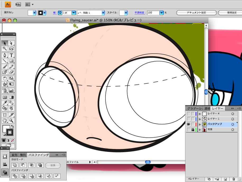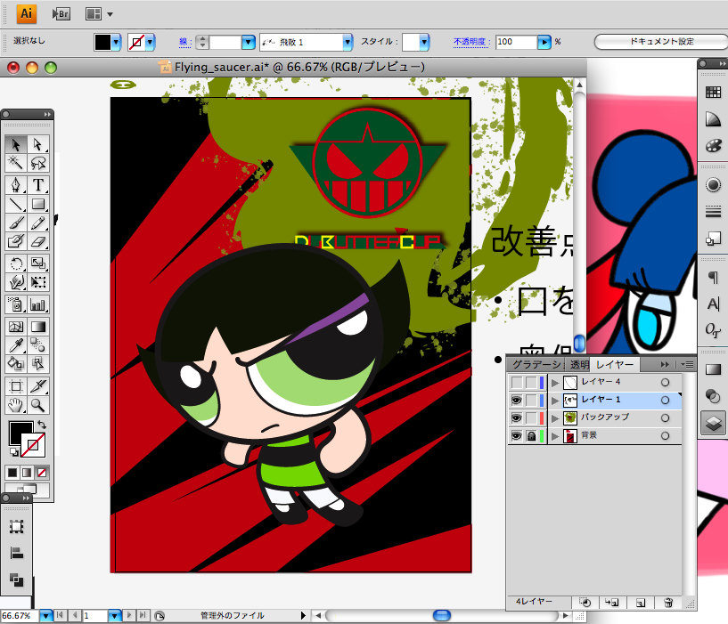 イラスト 2011/01/03 あけましておめでとう+Flying Saucer あけましておめでとうございます! 絵描きジャグラーのワリマルです。 ただ最近ジャグリングを全然やっていないので どちらかで言うと只の絵描きです(つω・) これからもブログの方ではイラストを載せていくのがメインになりそうです。 ホームページは何か見えなくなってしまってる…。 直すのも面倒なのでほっておいてますが気が向いたら再び開くかも。 それではイラストのお話。 今回イメージした洋楽はハードコアテクノ。 OphidianとRuffneckが作った「Flying Saucer」をイメージしてます。 描かれているキャラクターはおなじみパワーパフガールズのバターカップ。 実はこのイラスト(Flying Saucer+バターカップの絵)は 半年ぐらい前から描こうと思っていたのですが 自分の技術的に問題があって描けませんでした(特に背景部分)。 最近テクスチャの扱い方が解り始めてきて ようやく作成する事ができました。 バターカップの顔を描く途中はこんな感じです。 最近はIllustrator上でも十字線描いてます。 透明度を10%とかなり下げてるので見えにくいですがよく見ると点線でひいてます。 一週間前ほどは十字線引いてなかった気がします(つω・) 顔の線の太さは最初は8pt。途中から10ptに変更しました。 かなり前は初期設定の1ptのまま描いていたのですが カートゥーンの絵をトレースしてたら大分線が太い事に気付いて (というより普通の人は見るだけで気付くはず・・・) 最近は少し太めの線で描いてます。 目、顔は楕円形ツールで円を描いてから自由変形ツールで微調整。 ガーリー系やラクガキっぽい絵の場合は微調整しないのですが 今回カッコいい絵を描きたかったので必要でした。 こちらはボツになったパーツを組み合わせたモノ。 バターカップの右上にあるのは以前作ったロゴ。 ただ全体的に狭苦しくなるのでやめました。 緑色のインクっぽい形は既存のブラシをアウトライン化して ライブペイントを使ってます。 (イラレ使ってない人は意味不明な説明でゴメンナサイ(つω;) ちなみに今回描いたイラストのイメージ元の曲はこちら↓ テンポの早さとキックの音が大好きです。 始めからケンカ腰な曲調で入る辺りも自分としてはイイ! あとOphidianは基本的にハズレの曲が少ないから好きです。 エンジェル、ペガサス、特にバタフライVIP(Butterfly VIP)とかメチャクチャ良い曲です。 是非ハードコアに興味を持たれた方は聴いてみてください(・ω・)b