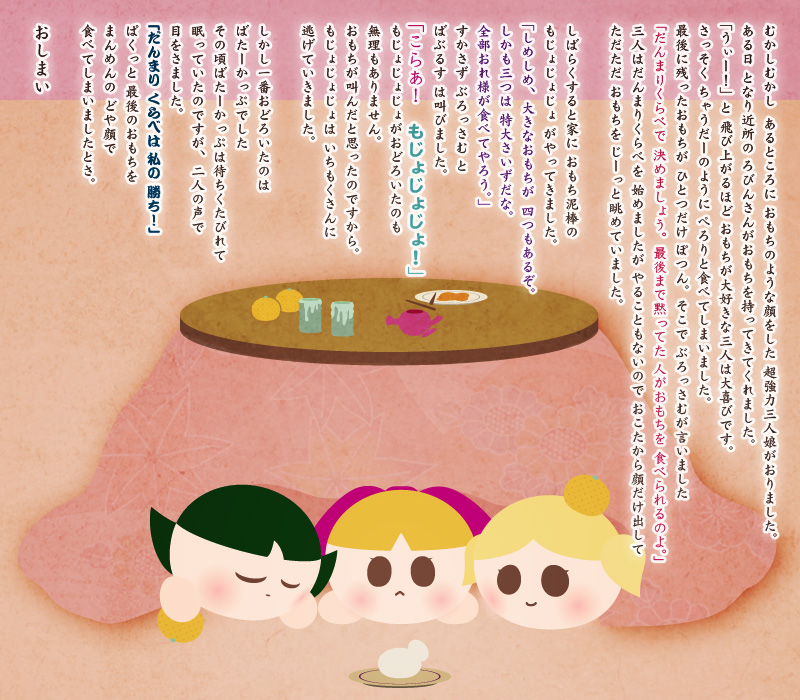 イラスト 2011/01/14 おこたガールズ 少し前に pixivに投稿した作品。 自己流に描いたパワーパフガールズです。 小さい頃に聞いた童話をオマケにオマージュして書いてます。 512kまでしか画像がアップ出来ないので解像度落としました。かなり汚いなぁ。 クリックして頂くと文章が読み易くなってます。