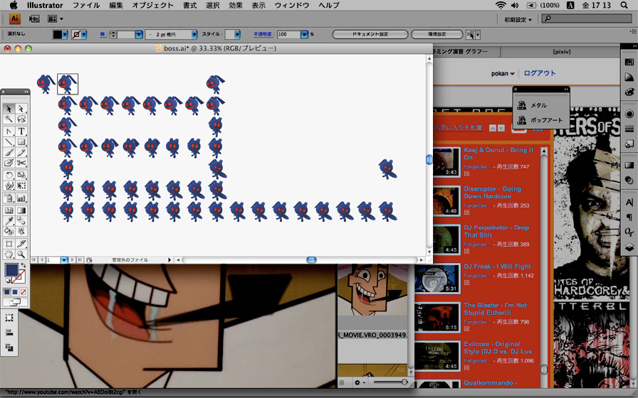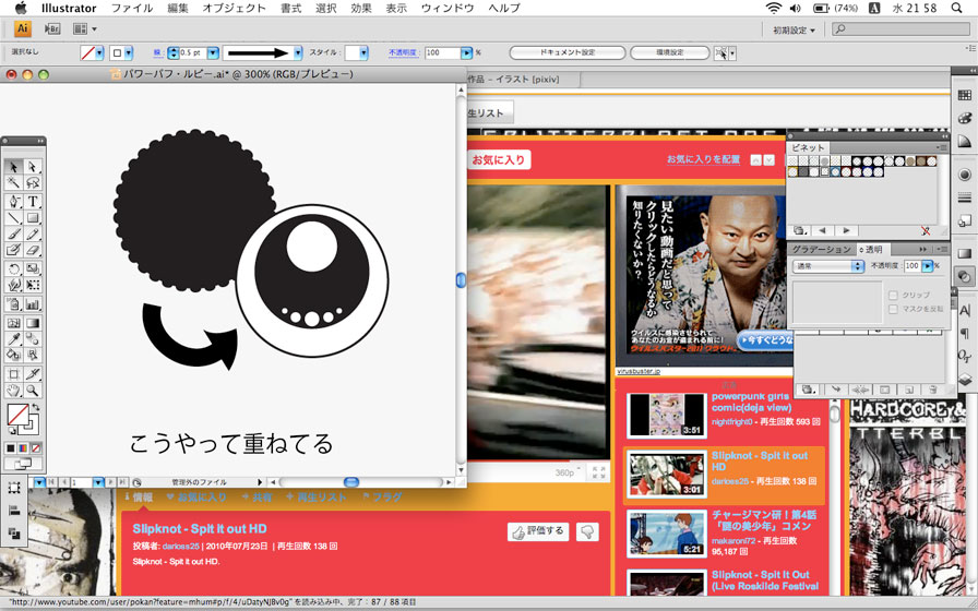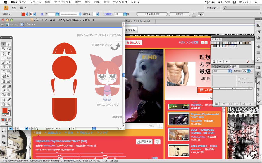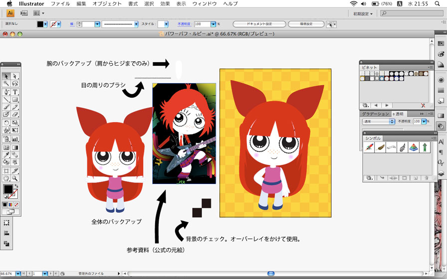 イラスト 2010/11/03 ルビッサム(ゴロ悪い) パワーパフガールズのブロ子ことブロッサムの格好をさせたルビー。 ルビーはカナダ産のカートゥーン「ルビー・グルーム」に出てくる赤毛の主人公です。 カートゥーンネットワークでたびたび見かけるので知らない人は是非見て下さい! 正面絵なのにメチャクチャ苦労して半日(たぶん5時間ほど)かかりました。 本格的に公式の絵に似せて描いたのは今回が初めてで勉強になりました。 かなり前に同作品のアイリスの絵を何度か描いたのですがルビーを描いたのは初めて。 個人的な感想としては顔は似せれたと思っているのですが いかんせん服装、体の形が全然雰囲気に似てない気がします。 あと髪型もやや手抜きな感じが否めません(つω・) ついでに公式の絵では腕部分に主線は無いのですが あっても無くても殆ど解らないのでグレーの主線をつけています。 今回は作業風景を少し載せてみます。 このブログを見ておられる人も少ないと思うので 遠慮なくイラレ用語をバシバシ使いながら説明させていただきます(・ω・)b 最近は基本的にIllustratorのみ。ペンタブも使わなくなりました。 アートボードの外側にあるのは制作する上で必要なモノ。 主にバックアップと参考資料。 ルビーちゃん独特の目のフチ部分は自分はこうやって作っています。 真っ黒の円にマルが沢山あるブラシを作成して使用しています。 黒目の下の方にある複数ある小さな光沢部分は ステップ数を1に設定したブレンドを使用したり。 …関係無いけど画面右上に写ってるオッサンが不気味。 Youtubeの広告です(つωー) 髪を分解したらこんな感じ。おおまかに分けて4層にわかれています。 …また関係無いけど、背景にslipknotのコリィさん写ってます。 これ描いてる時は殆どSlipknotばっかり聴いてました。あとOK Goとか。 今思うと描いてる絵の雰囲気と真逆な音楽を聴いてる時が多いです。 なんだか最近Slipknotにハマりすぎ。 以上こんな感じです。 またこれからも絵を描くとは作業風景も載せていく予定です。 ただ面倒なので毎回載せることはないと思います。ごめんちゃい(つω・)