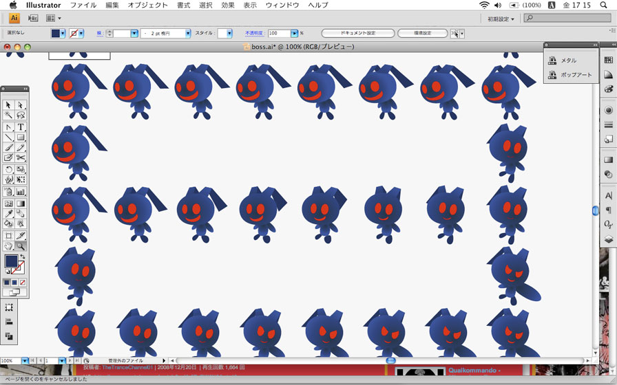 日常生活 2010/11/05 STGボス 学校の課題でシューティングゲームのボスキャラを描いてます。 周りの生徒に負けないように自分は独自で編み出した技法で作ってます。 どんな技法かはまたの機会に説明。 大体こんな感じ。 キャラ自体は凄くシンプル。 ただ滑らかな動きが可能で無限大にコマ数を増やせます。 (結局容量が重くなりすぎると困るのでコマ数は8~16にしてますが(つω・) こちらは拡大したところ。 たぶんIllustratorに詳しい人が見たら何をしたのか一発で解ると思います。 キャラ自体はオリキャラのノイズウサギが元です。