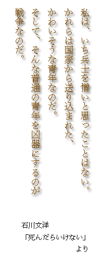 日常生活 2009/09/26 石川文洋:「死んだらいけない」より 戦争にまつわるおはなしの本から引用。 自分が普段から考えたり悩んだりしている点です。 ふつう一方的に加害者の国の兵隊を責めるものですが その兵士も被害者ですもの。