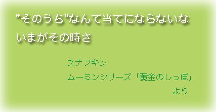日常生活 2009/09/26 ムーミンシリーズ:スナフキン ムーミンの「黄金のしっぽ」の冒頭でスナフキンが言ってた台詞。 なんか松岡修造さんも言いそう。 「そのうち」って後回しにすると結局忘れたりやらなかったりする事って 多いですよね。