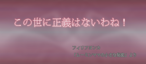 日常生活 2009/09/27 フィリフヨンカ:「ムーミンママの小さな秘密」より そもそも何が正義で何が悪なのかと聞かれると答えにくい。 これは「愛とは何か」という永遠に解けない哲学に匹敵するんじゃなかろうか。 話が少しズレますがカートゥーンネットワークのポップコーン (主に映画作品が放送される時間帯)辺りででパワパフ、スターウォーズの広告で 「正義vs悪」というのを目にしますが、このフレーズを見る度に 何か色々と考えてしまう。まぁ架空の話なんだし堅苦しく考えずに 映画作品を見てもらう視聴者を盛り上げるためのフレーズと思えばいいのですが…。 以前イラク戦争が始まった時にブッシュ大統領が「これは正義の戦いである」 みたいな事を言ってた気がするけど戦争に正義も悪もあるのか。 もう少し身近な方で見ると学校に通わない不良は全てが悪だろうか。 そりゃ犯罪を犯したり人に迷惑をかけるのはよくないけれど 何も人を困らそうと思ってやってる人は居ない筈。 自分のことしか考えれない時、偏見でしか物を見れない時。 こんな時間をもっと減らしていけたら良いんだけどなぁ。