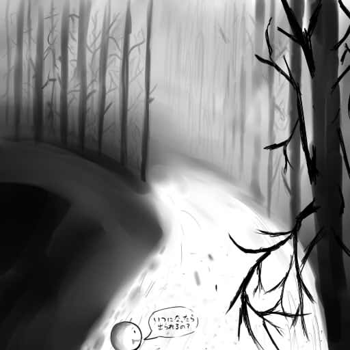 イラスト 2009/08/25 薄暗い森 今回は珍しくトレース絵でなく、一から描いてみました。 背景の練習です。 薄暗い森。今回トレースではないのですが写真を参考にしているので実在する場所みたい。 読みにくいですが下のワリマルは「いつになったら出られるの?」と言ってます。 実は人が居ます。ほぼ背景と区別できませんが。