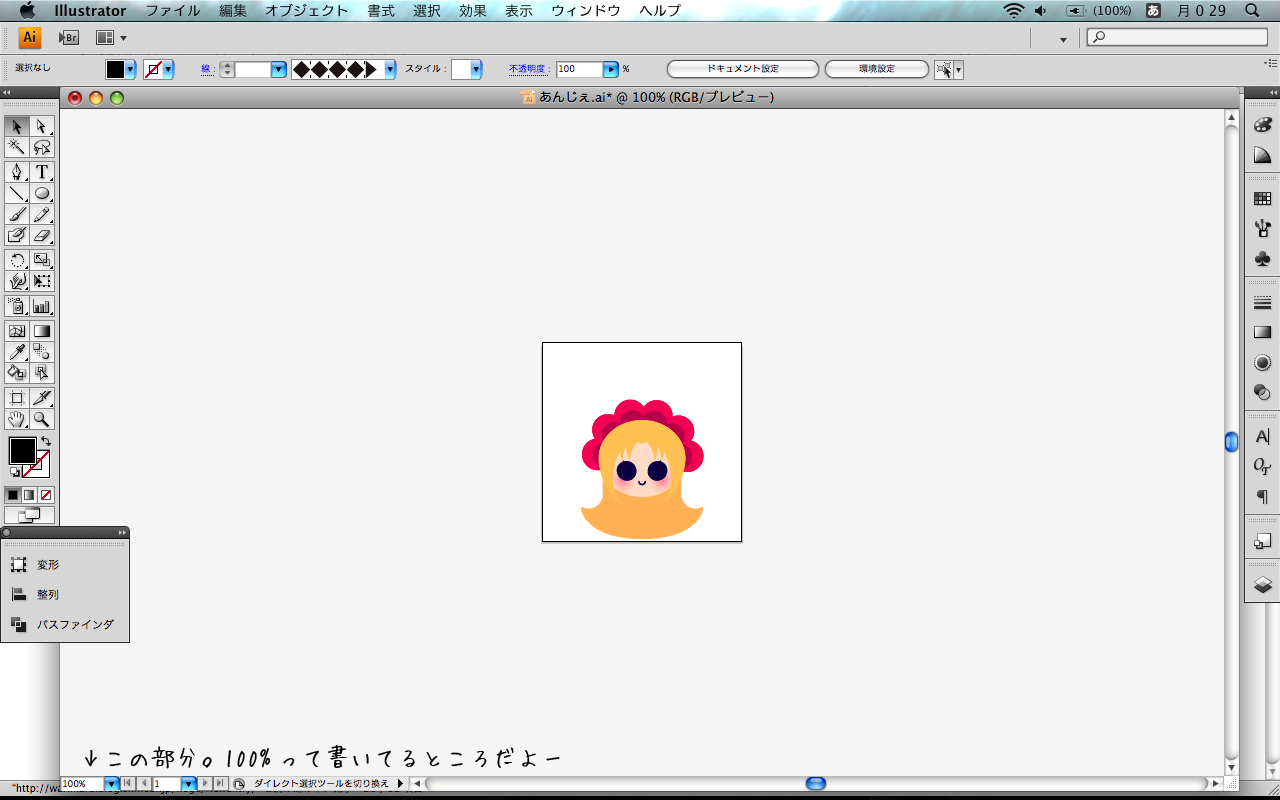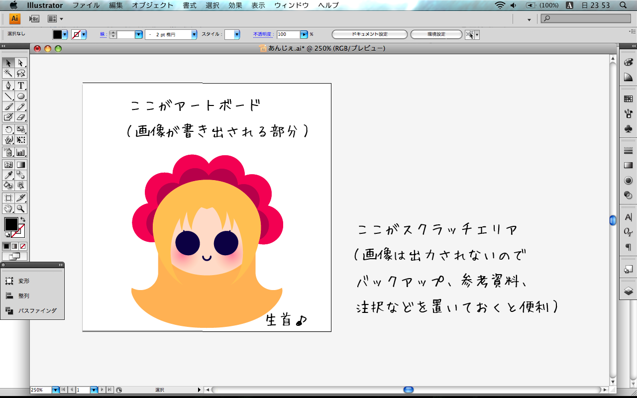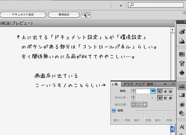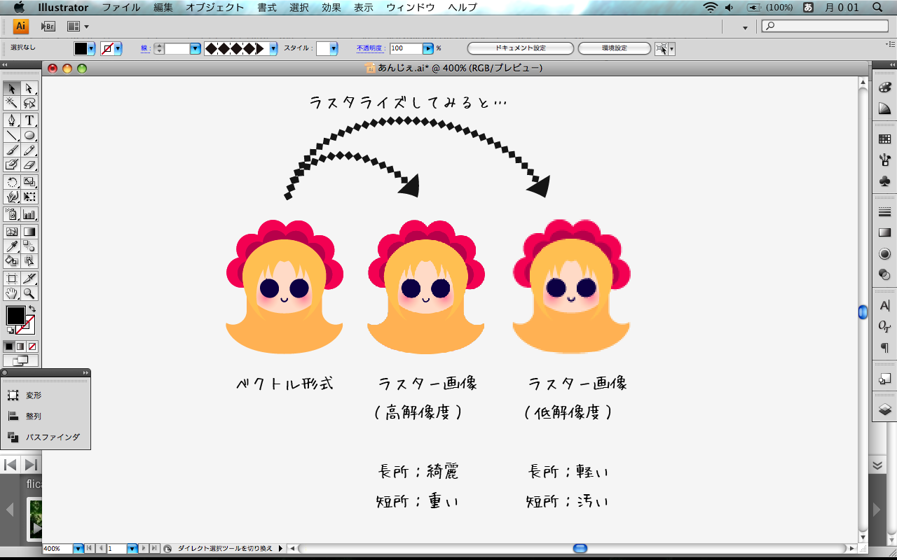 Illustrator 2011/03/28 Illustrator用語その1 イラレ検定に向けて勉強中。 イマイチ意味が解らなかった用語や機能などを並べてみます。 今回は3級の問題を読んでて出てきた用語を取り上げます。 ●パネルとは: 初期設定のワークスペースで右側に表示されている 色、線を変更させるところ。ドックをクリックしたら出る窓。 下の画像では線を変更するパネルを表示してます。 なんだかうまく説明できない…。「〜らしい」ばっかりでごめんなさい。 ここに詳しくかいてありますね。堅苦しくてあまり読む気がしませんが。 ○オーバープリントとは: これってイラレ用語じゃなくてDTP用語だわ。 既に印刷されている部分から、さらに印刷する手法。 オーバープリントすることで版ズレを防げるものの、問題点アリ。 …意味は頭で大体理解できてるけど説明するのが難しいかも。 ●スクラッチエリアとは: 「スクラッチエリア」はアートボードの外がわ。 ちなみに自分はアートボードはキャンバスとでも思ってます。 たしかCS4以降はShift+Oで編集できたはず。 ●ズームポップアップメニューとは: 拡大率を直接入力できる場所。 画面左下にあるだけど…キュートなくらいに ちっこい。めんこい。 ズームツール(虫メガネ)を使っても イマイチな拡大率になってしまう場合に使えます。 普段何度か使ってましたが名前まで知らなかった。 カーソルあわせてもなぜか名前が表示されないから余計に覚える機会がなかった。 ●ラスタライズとは: ベクトル画像をラスター画像(ビットマップ画像)へ変換する操作。 つまりイラレのベジエ曲線で描いたモノをドット形式の画像にすること。 これは今まで数えきれないほど行ってきた操作だったけど イマイチ意味が解ってないままやってました。 ラスタライズはイラレよりPhotoshopで行う方が多い気がします。 ○「ハンドル」と「方向線」と「方向点」について: ネットのイラレ講座のページを見てると ①「ハンドル = 方向線 」って解説されてるページと ②「ハンドル = 方向線と方向点」って解説されてるページとわかれてるんですよね。 自分は今まで②だと思ってましたがAdobe社の説明を見た限り①で正しいようです。 でも①が正しいとなると 「じゃあハンドルって言葉は何で生まれたんだろうか?」って考えてしまう(つω・) これは完全に①が答えだと思わない方がいいのかも。 ●グループ選択ツール: 今まで知らなかったツール。結構便利!説明はここに書かれています。 グループ化されてるオブジェクトをクリックするたびに 選択範囲が増えていくというすぐれもの。 今まで自分はダイレクト選択ツールか自動選択ツールを使ってたのですが 場合によってはこのツールの方が早いですね。 ●カラーモデルとは イラレ用語というよりIT用語?パソコン用語?的なモノですが 色を表現する方法のことです。例を挙げるとRGB、CMYK、HSBなどのこと。 個人的な印象として RGB …ゲームなどのディスプレイ表示向き、あとほっぺの赤さが作りやすい。 CMYK…印刷向き HSB …色相、彩度、明度を簡単に帰られるのでかなり便利。 Adobe社の説明はこれ。 ●グラデーションツールをダブルクリック: 知らなかったけどグラデーションパネルが表示できるんだとか。 いちいちクリックする手間が省けて楽。