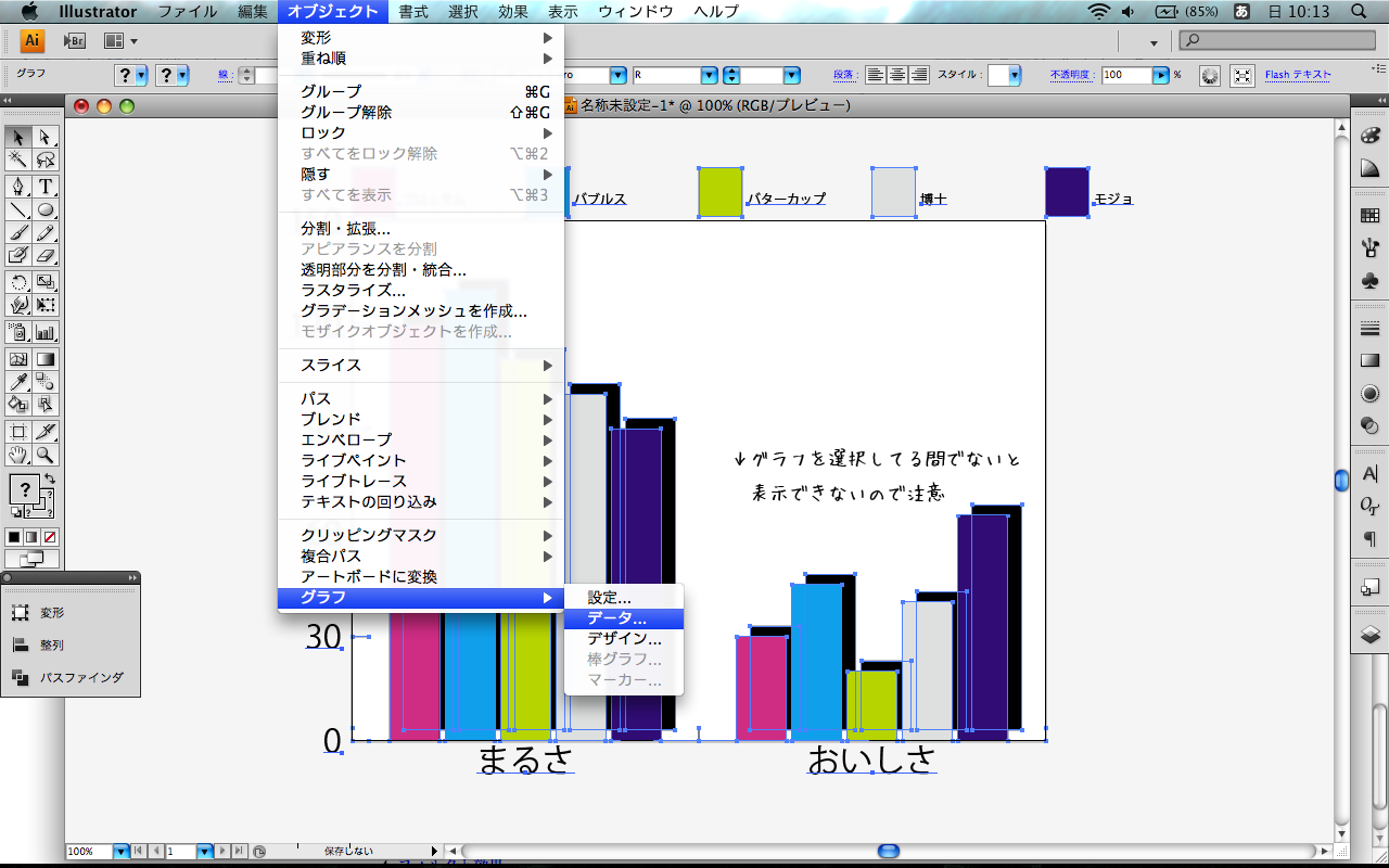 上の図のように「オブジェクト」の「グラフ」にある「データ…」を