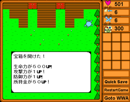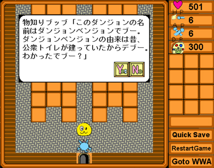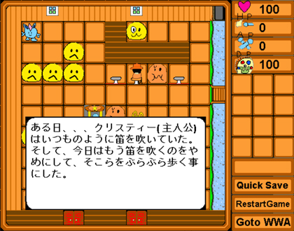 ゲーム 2014/03/08 シャイニングボールズ 私が小学生の頃に「シャイニングボールズ」というオリジナル漫画を アナログで描いていたのですが、ゲームも作ってました。 利用したソフトはブログのリンクにも張らせていただいてるWWA。 当時「ゲーム制作を始めてみたい」という人に一番オススメなソフトでした。 ゲームの主人公は漫画でも主人公を勤めたクリスティ。 スタート地点は仲間が大勢いる屋敷。 アイテムを取ってパワーアップ。 敵とのバトルはありましたが、難易度は低めで 普通にプレイしてるとゲームオーバーになることは無かったはず。 ダンジョン便所ン(つд・) そんなどうでもいい由来を教えられても……。 ゲームはこちらの外部サイトにあるのですが古すぎるせいか 「セキュリティ設定によってブロックされたアプリケーション」と Javaのエラーが起きて起動できません。私の環境ではエラーを解決させれば 遊ぶことが出来ましたが、手順が面倒だったのでオススメできません……。