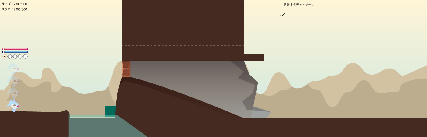 ゲーム 2014/03/30 AS3横スクロールアクションゲーム制作51 今回はFlashゲーム制作の進行状況を書いていこうと思います。 なかでもステージについて書いていきます。 前作(ダイアモンド・ビーチ)のステージは全3面で 画面のスクロール方向も横方向のみでした。 しかし今作からはマップ内を上り下りできてステージ数も全11面。 全11面というのはあくまで予定なので進行状況によって増減させます。 そんなことで、思い切って次回作のステージの一部を公開いたしまする。 このステージはスタート地点。初めて主人公を動かせる場所です。 上の図では殺風景ですが、これは初期に決めたラフなので実際は全体に調整をかけてます。 今では建物がいくつか建ってたり、不思議でおかしな空間が出来上がってます。 昔からゲームを何度か作ってきて思ったことなんだけど 制作段階の序盤にはりきり過ぎて、いろんな要素を詰め込もうとするけど 詰め込み過ぎたぶんだけ途中で投げ出したり挫折しやすい。 ゲームを作った人なら誰もが経験をしたことがあるはず……! 『いかに面白い要素を足していくか』というのも重要だけど 『いかに面白い要素を引いていくか』という見切りをつける、諦める気持ちも 実はけっこう大切なんじゃないかしら、と思います。 今後も挫折しない程度に進めていきたいですね(´ω`人)